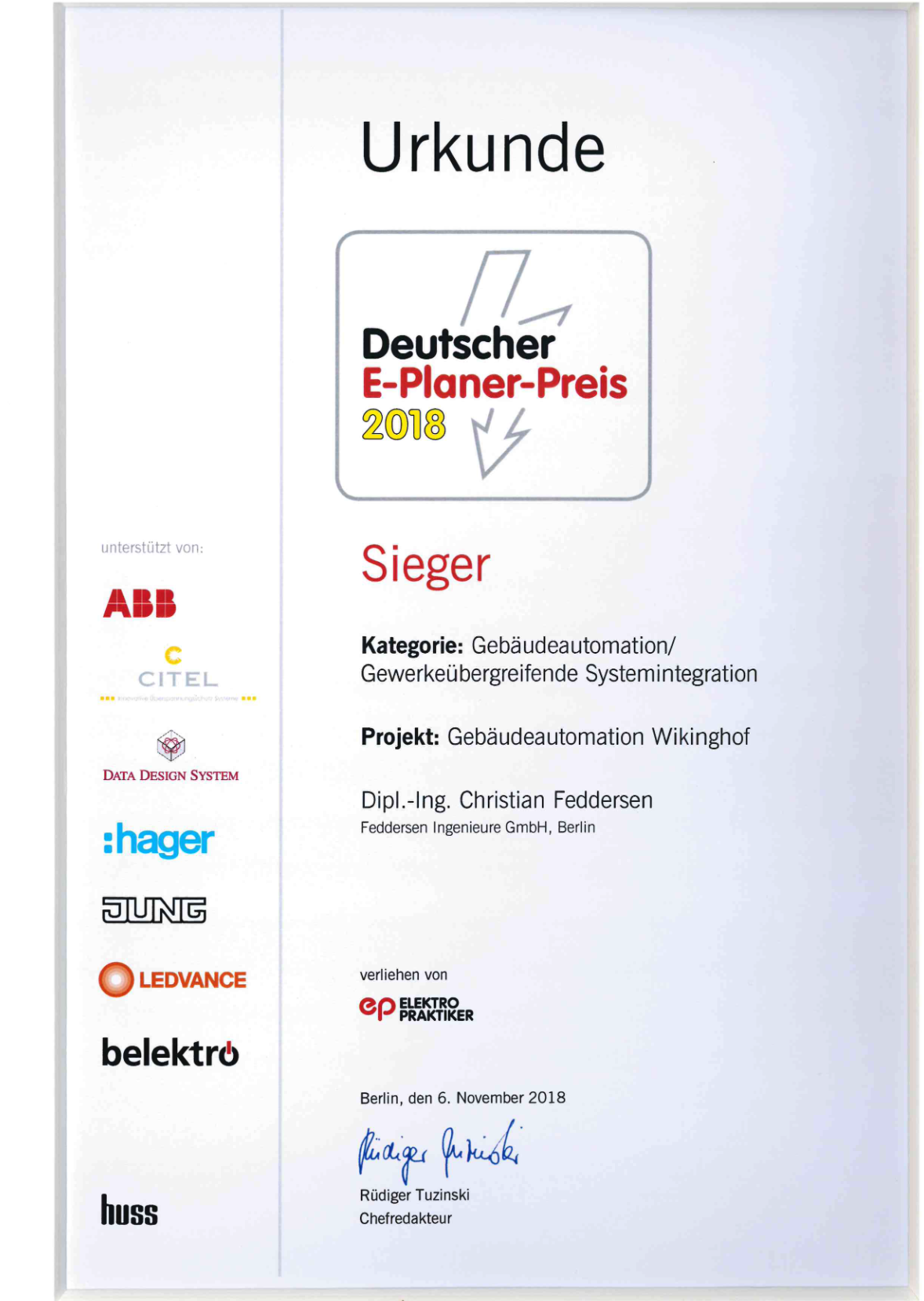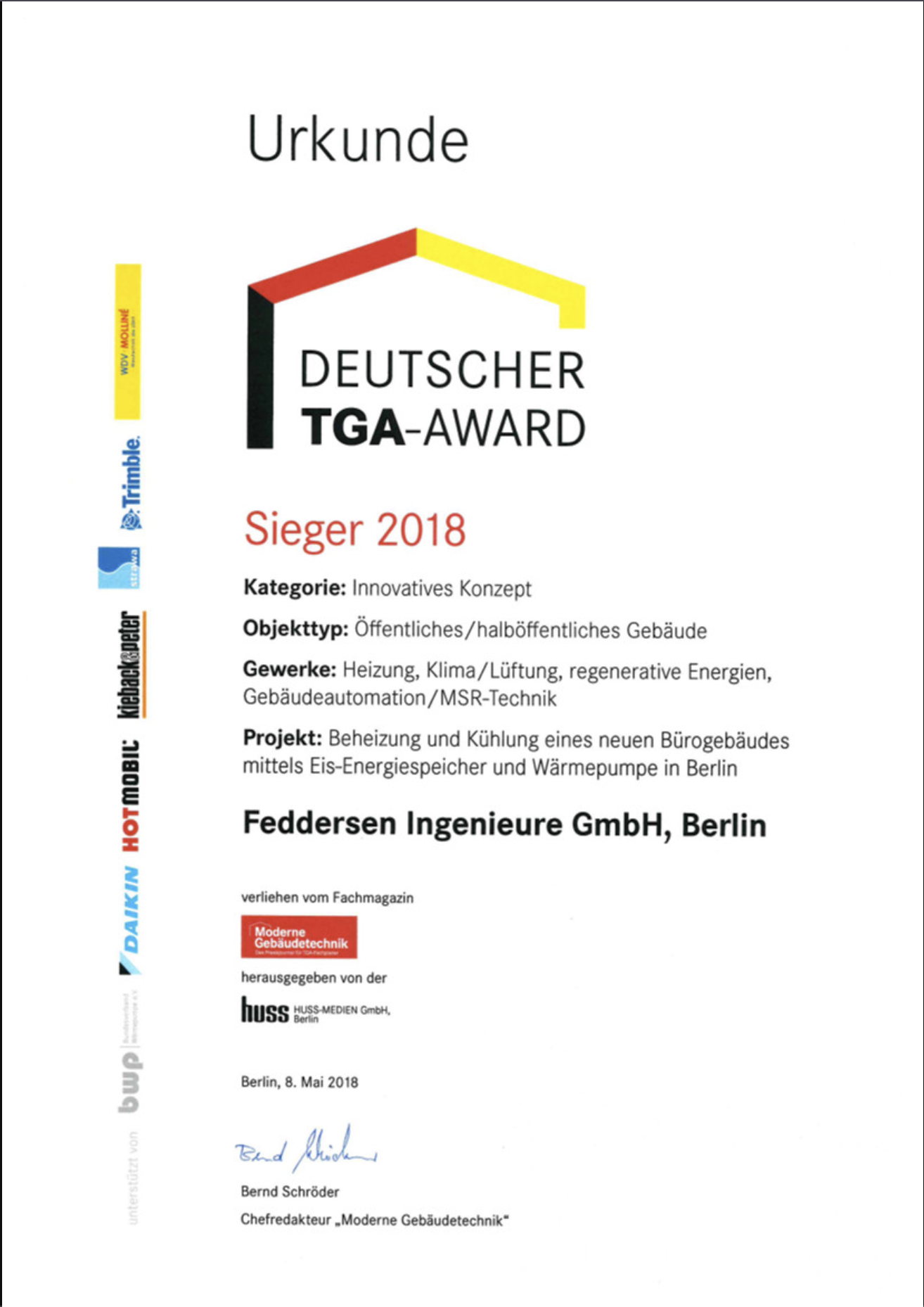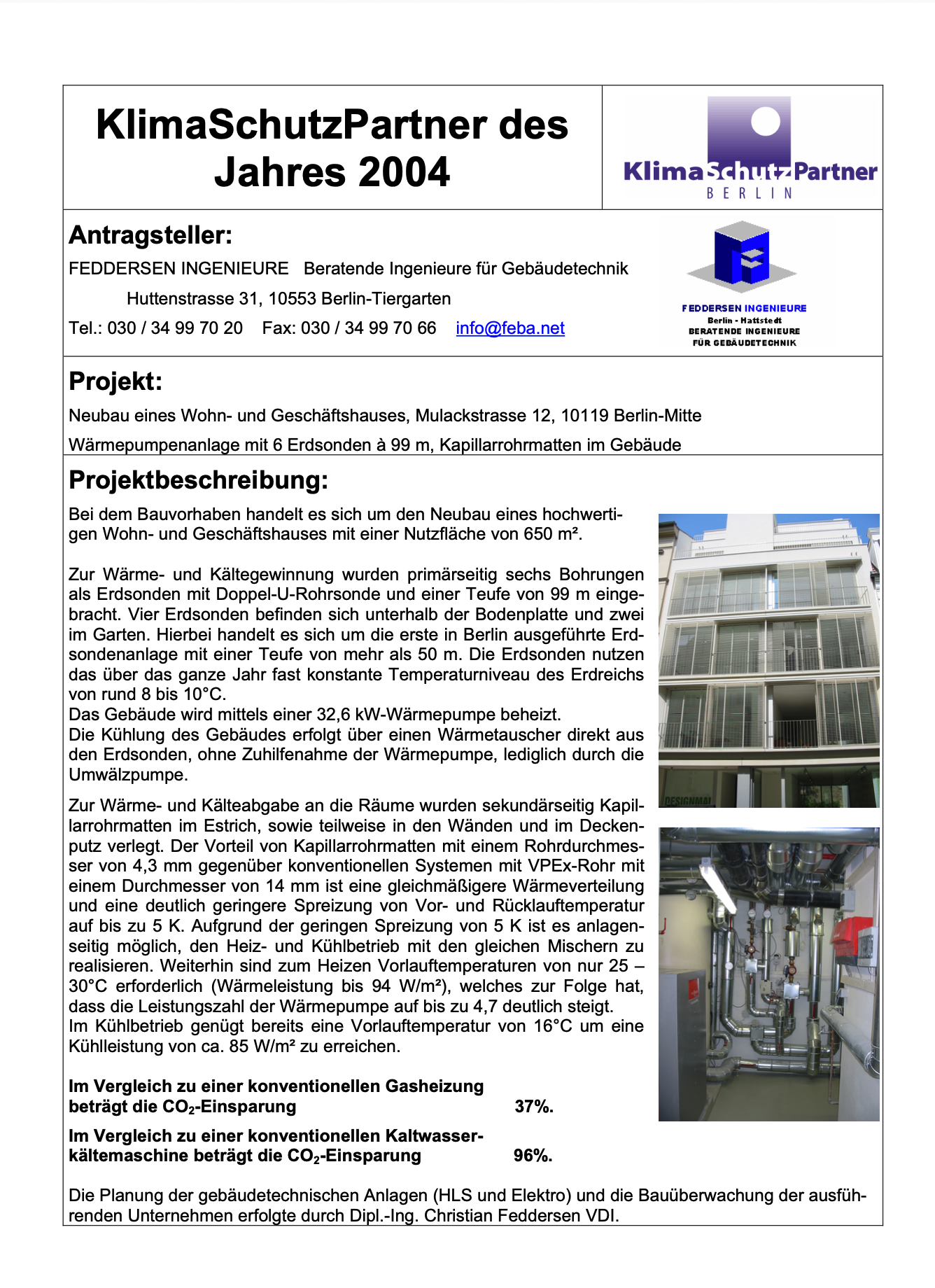 Für das Inovative Konzept: Beheizung und Kühlung eines neuen Bürogebäudes mittels Eis-Energiespeicher und Wärmepumpe in der Waldstraße 80 in Berlin Reinickendorf.
